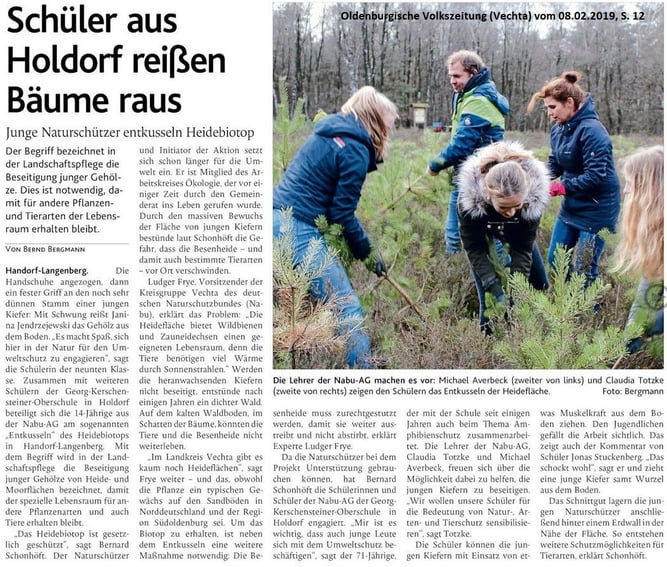 17 Schüler/innen der NABU-Arbeitsgemeinschaft der Georg-Kerschensteiner-Schule befreien Sandheidefläche von Kiefern-Buschwerk. Seltene Biotope für Zauneidechse und Wild- bienen werden so erhalten. Es unterstützen die Gemeinde und als Eigentümer die kath. Kirche.